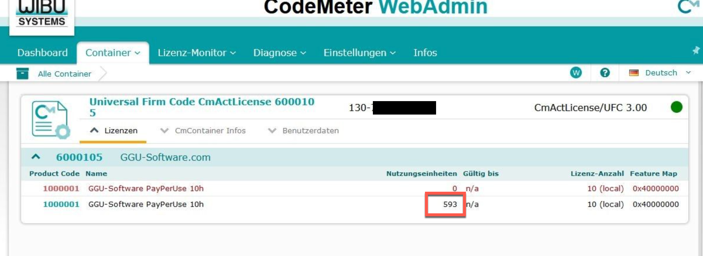 Im CodeMeter Webadmin wird unter dem Reiter “Container” für den Lizenzeintrag “GGU-Software PayPerUSe 10h auch die restliche Laufzeit (Nutzungseinheiten siehe Bild) angezeigt. 10 Stunden sind 600 Minuten Nutzungseinheiten.
